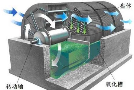 废水处理生物转盘又称浸没式滤池,它由许多平行排列浸没在一个水槽(氧化槽)中的塑料圆盘(盘片)所组成,盘片的盘长近一半浸没在水中,盘片上长着生物膜,它的工作原理和生物滤池基本相同。盘片在与之垂直的水平轴带动下,缓慢地转动,浸没在废水中那部分盘片上的生物膜便吸附废水中的有机物,当转出水面时,生物膜又从大气中吸收所需的氧气,使吸附于膜上的有机物被微生物所分解,随着盘片的不断转动,最终使槽内废水得以净化。